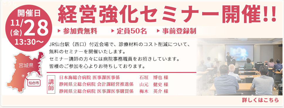数多くの自治体病院の皆様からご意見を頂き、各種メニューをご用意した出前講座、病院職員の皆様の福利厚生(ベネフィット・ステーション)・病院の経営改善・患者サービスの向上の為に効果的な事業(MRPベンチマークシステム、医薬品の値引率調査等)にも取り組んでいます。