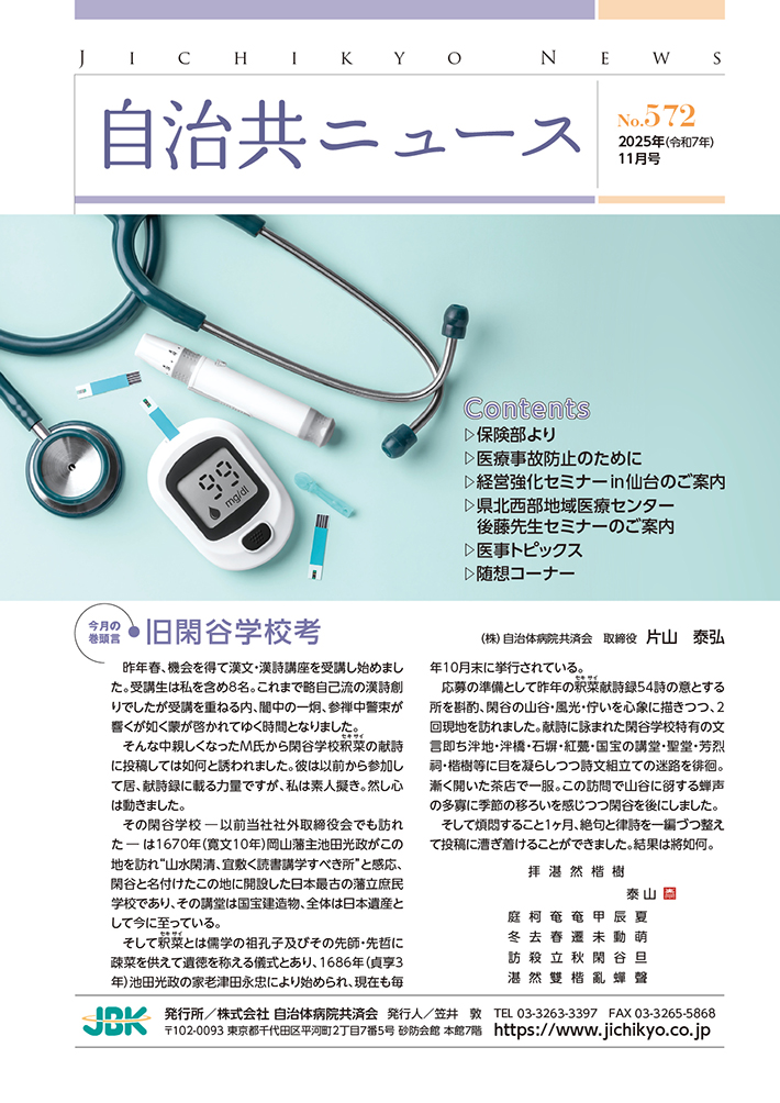 第62回全国自治体病院学会を終えて / 保険部より 保険部主催研修会のご案内 / 医療事故防止のために / 中小病院に未来はあるか?Webセミナー開催のご案内 / 病院経営改善セミナーのご案内 / アフターコロナの自治体病院~人口減少時代にどう対応するか~地方議会議員セミナー開催のご案内 / 地域医療セミナーWebのご案内 他 |